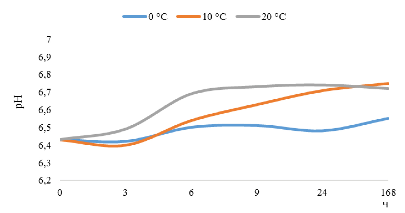 Fig. 3. Change in pH when changing the temperature and contact time of the sorbent (walnut shells) with sorbate (waste water)