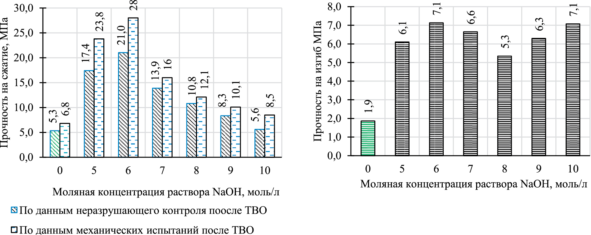Результаты испытаний исследуемых образцов с различной концентрацией щелочного активатора на определение прочности на сжатие и изгиб после тепловлажностной обработки приведены на рис. 1.