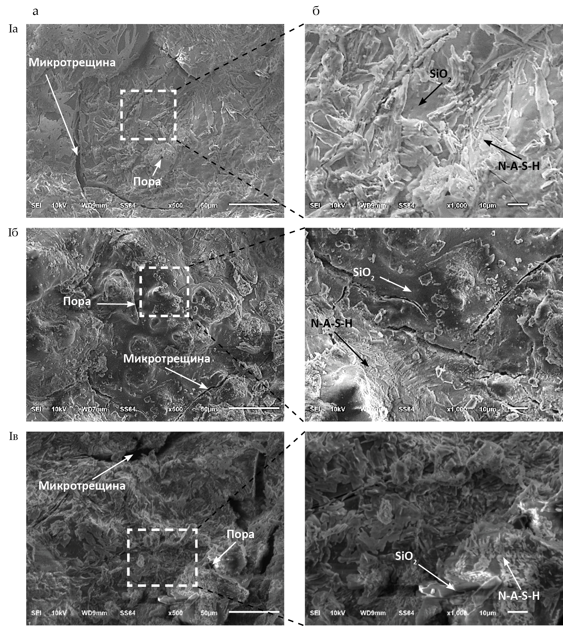 Из рис. 3 видно, что образцы в целом имеют плотную структуру, однако существуют микротрещины с разной степенью раскрытия. Наиболее плотная структура характерна для состава с высокой прочностью Iб. Для состава Iв характерно увеличенное раскрытие трещин. Возможно, это связано с появлением щелочной коррозии заполнителя, вызванной реакцией щелоче-кремниевой кислоты на его поверхность и последующим появлением значительного объема геля рыхлой структуры [10]. Так, из микроснимков видно, что на поверхности частиц пылеуноса и мелкого заполнителя образуются в виде паутины или наслоения из геля N-A-S-H и кристаллических структур новообразований. Степень этого наслоения меняется в зависимости от концентрации щелочного активатора. Наибольшая степень образования геля соответствует составу Iв c концентрацией 7М. В целом анализ морфологии образцов свидетельствует о габитусе гидратных фаз, который схож с минералогической группой цеолитов листоватой или пластинчатой формы (особенно для состава Iв) или волокнистой формы.