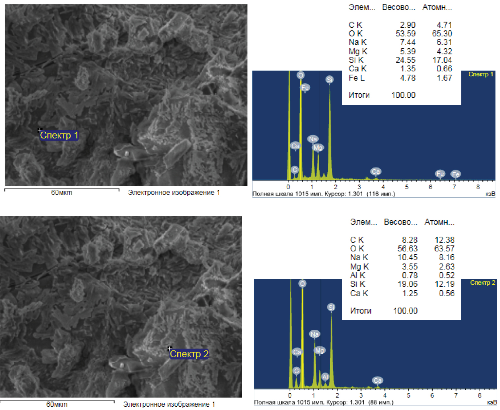 Как видно из рис. 4, структура пластинчатых кристаллов для двух спектров преимущественно состоит из элементов Na, O, Mg, Si и Ca. Также отмечается присутствие элементов Al и Fe. Количественный анализ показал, что максимальные пропорции элементов характерны для О (спектр 1 – 53,59 %, спектр 2 – 56,63 %). Так как щелочной активатор на частицу пылеуноса влияет с внешней стороны, то содержание элемента Na ниже в спектре 1 (7,44 %) в отличие от поверхностных слоев спектра 2 (10,45 %). В свою очередь, количество элементов Si в спектре 1 составляет 24,55 %, в спектре 2 – 19,06 %. Содержание Al и Ca в двух спектрах ‒менее 2 %. Это означает, что для рассматриваемого образца формирование цементной матрицы, очевидно, связано с реакцией между щелочным активатором и частицами пылеуноса, состоящими преимущественно из кремнеземистых структур. На основе анализа морфологии и спектроскопии можно предположить, что в образце из-за геля N-A-S-H фактически отсутствуют гидратные фазы взаимодействия активного CaO с водным раствором щелочи.