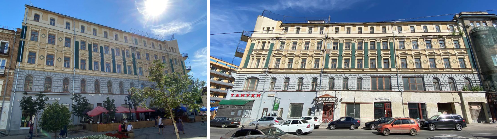 Здание имеет два главных фасада в стиле эклектики с отдельными элементами модерна, что позволяет отнести объект к поздней эклектике, которая испытывала влияние модерна (рис. 1). Скошенный угол здания акцентирован балконами с металлическим ограждением на высоте трех-пяти этажей и аттиком полукруглой формы. Здание пятиэтажное с подвалом, выполнено из полнотелого красного кирпича на известковом растворе, с различной поэтажной отделкой фасадов.