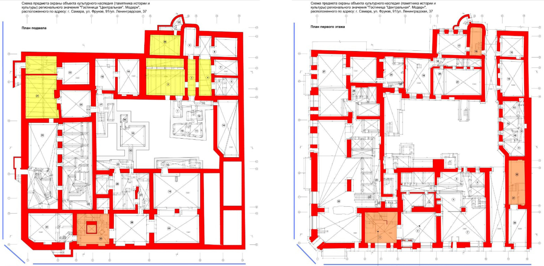 Fig. 6. The plan of the basement and the first floor with the designation of the subject of protection: facades, load-bearing structures of walls, stairs and arches of Monier