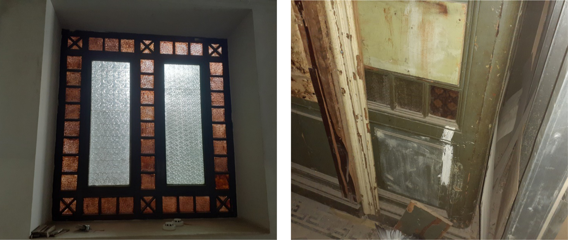 Рис. 7. Витраж между лестницей и коридором; фрагмент первоначальной лифтовой перегородки