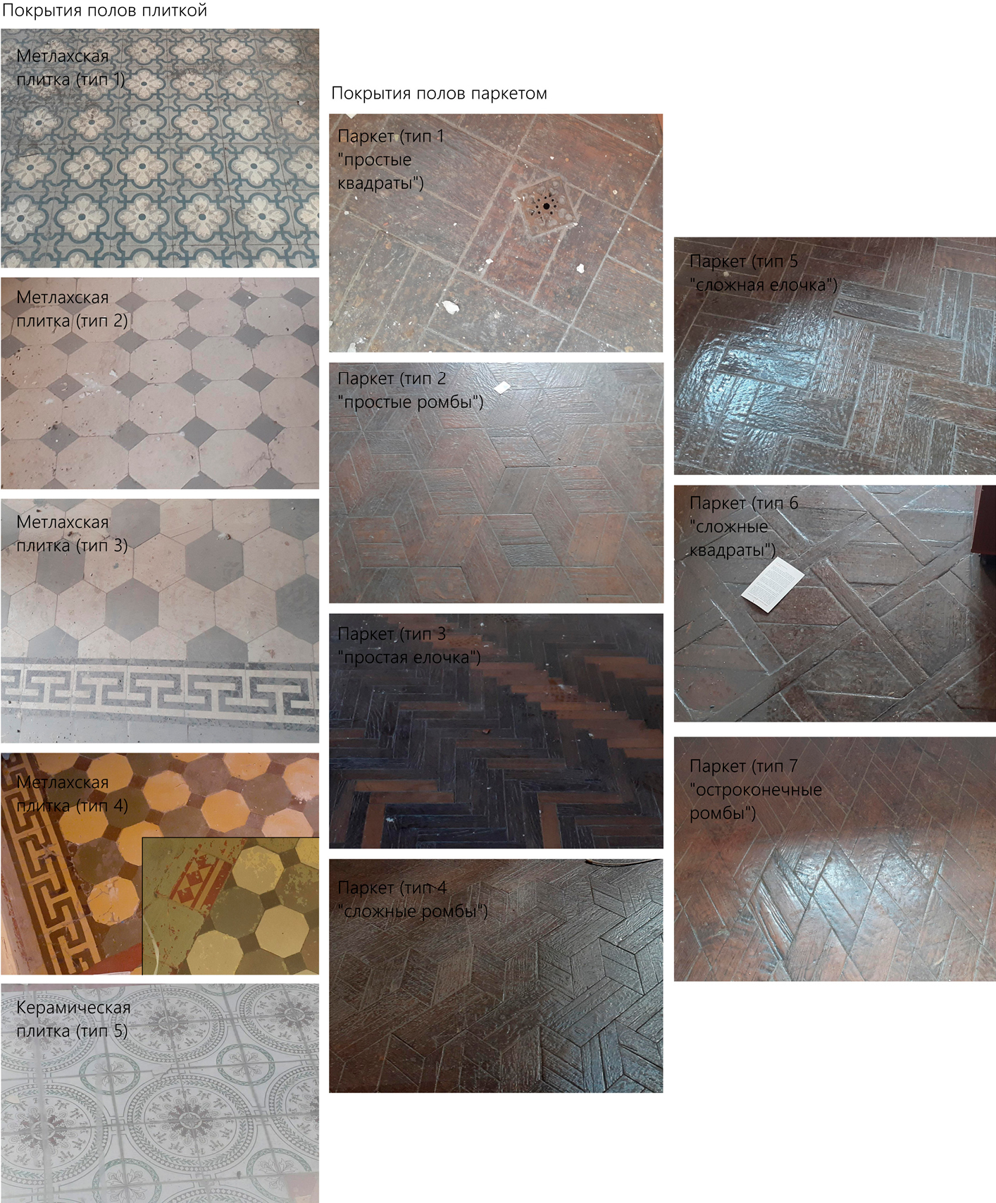 Полы в части помещений общего пользования и части номеров гостиницы отделаны темным дубовым паркетом с явно выраженной брутальной фактурой. Первоначальный рисунок отделки полов фактурным дубовым паркетом имеет несколько типов (рис. 9):