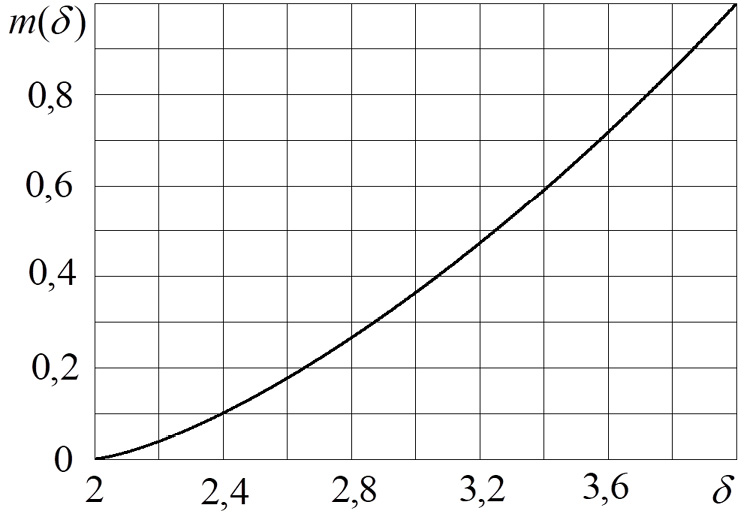 Функция φ₁(m) изменяется от 2 при m → 0 до 4 при m → 1. Видно, что эта функция монотонна и потому обратная к ней функция m(δ) однозначна и тоже монотонна. Данная функция изменяется от 0 при δ = 2 до 1 при δ = 4. График этой функции приведен на рис. 2.