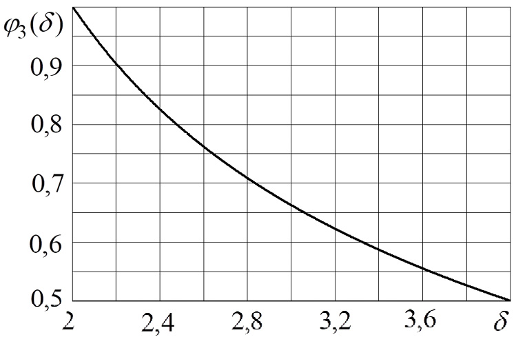 Рис. 3. График зависимости функции φ₃(δ) ≡ φ₂(m(δ)), необходимой для вычисления коэффициента фильтрации среды по формуле (7), от отношения времени полного впитывания и времени половинного впитывания δ ≡ t₁ /t½