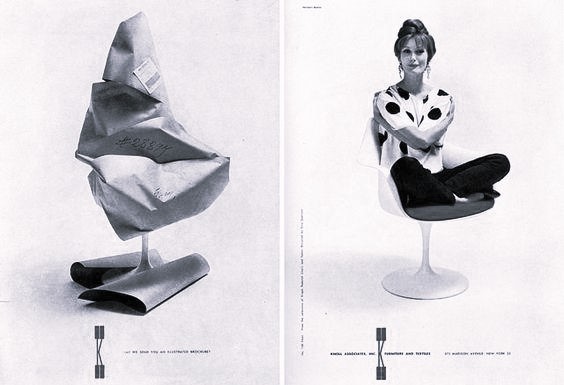 В 60-е гг. XX в. настоящий фурор среди обывателей произвела серия рекламных плакатов, созданная Гербертом Меттером для мебельной компании Knoll. Первый плакат серии предлагал зрителям догадаться, что скрывается под упаковочной бумагой на фото. Тогда никто не мог себе представить, что такая форма может принадлежать стулу. Пластики открыли совершенно новые возможности формообразования, обозначив начало эпохи футуристического дизайна (рис. 1).