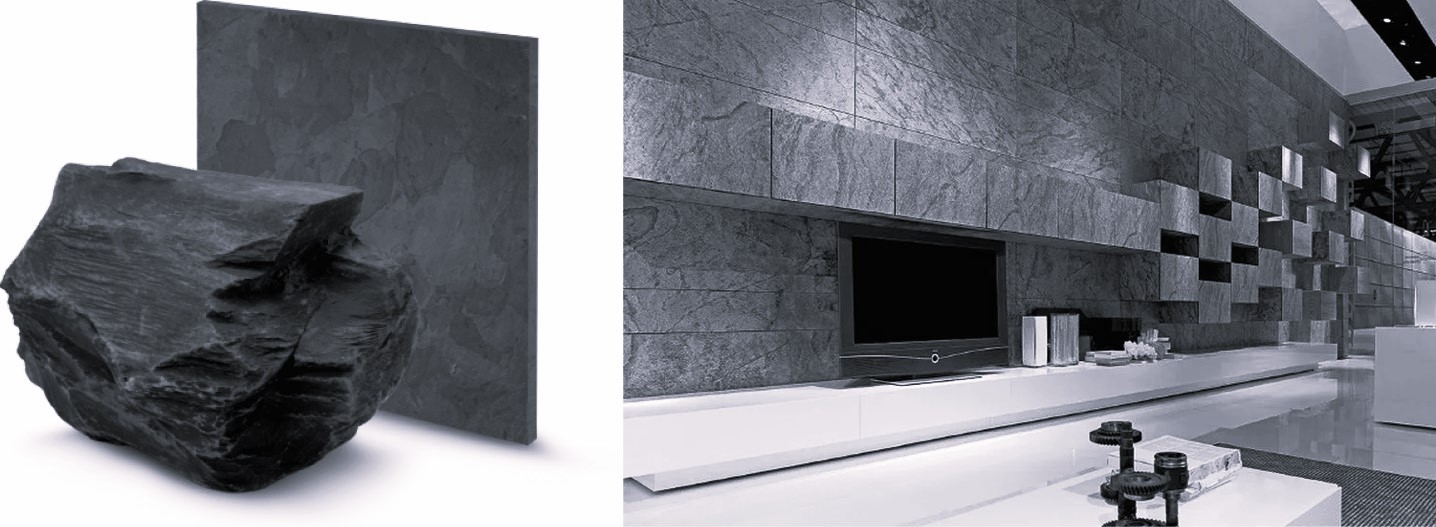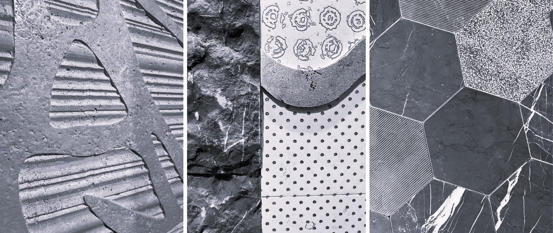 Новые технологии способны давать альтернативное звучание традиционным материалам с многовековой историей. Так, уникальная мастерская по работе с камнем GLIVI в Минске, Беларусь, демонстрирует новый язык для представления традиционного натурального камня в современном интерьере и экстерьере. Фрезеровка, полировка, шлифовка и качественный распил, термическая и так называемая «античная обработка», а также соединение разных технологий в одном фрагменте могут обеспечить неожиданные дизайнерские решения. Так, на рис. 3 показаны примеры сочетания технологий грубого скола камня с полированным и фрезерованным материалом. Современный принт или штриховка, словно наложенные независимым слоем на текстуру камня, придают традиционному материалу свежее, современное звучание.