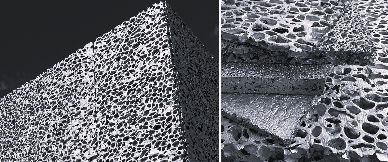 Инновационные материалы претендуют на характеристики, которые выгодно отличают их от первой группы традиционных материалов. Они стремятся к экологичности, но преодолеть этот порог могут только за счет экономии ресурсов при их производстве и эксплуатации, потому что являются композитными, а не природными по сути. Хотя на сегодняшний день так называемые экоматериалы заняли уверенную нишу в современном дизайне и архитектуре. Так, уже существует светогенерирующий цемент, самовосстанавливающийся бетон и конопляная арматура, которая возможно скоро станет недорогой низкоуглеродистой альтернативой стандартной стальной арматуре и позволит избежать проблемы коррозии, продлевая срок службы бетонных конструкций. Или возьмем, к примеру, другой инновационный материал – прозрачную древесину. Она имеет такую же прочность, как классические пиломатериалы, но заметно легче, изготавливается путем прессования и обработки полимерами тонких древесных полос, является отличной заменой стекла и пластика. Прозрачная древесина не разбивается при ударе, не бликует и прочнее стекла. И конечно, этот передовой материал снижает энергопотребление за счет минимизации потребности в искусственном освещении. Другой пример инновации в мире архитектурных материалов – панели Alusion, которые представляют собой форму облицовки, изготовленную из стабилизированной алюминиевой пены. Они прочные и легкие, как металлические губки, пожаробезопасные, звуконепроницаемые и простые в установке (рис. 8).