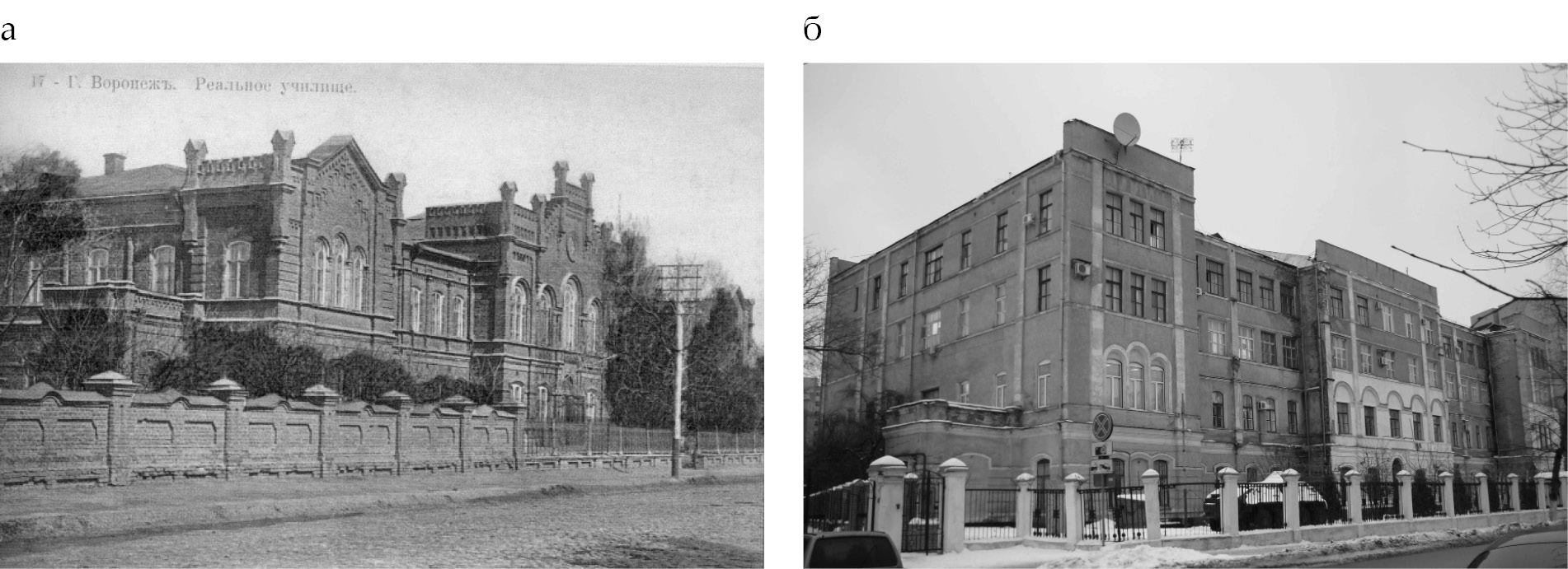 Рис. 4. Высшее начальное училище, г. Воронеж, ул. Комиссаржевской (б. Тулиновская), 17: а – архивное фото 1920–1930-х гг.; б – современное фото Е.А. Чернышевой, декабрь 2020 г.