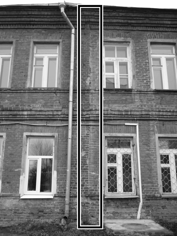 Рис. 8. Вертикальный стык кирпичной кладки на дворовом фасаде здания. Фото Е.А. Чернышевой, декабрь 2020 г.