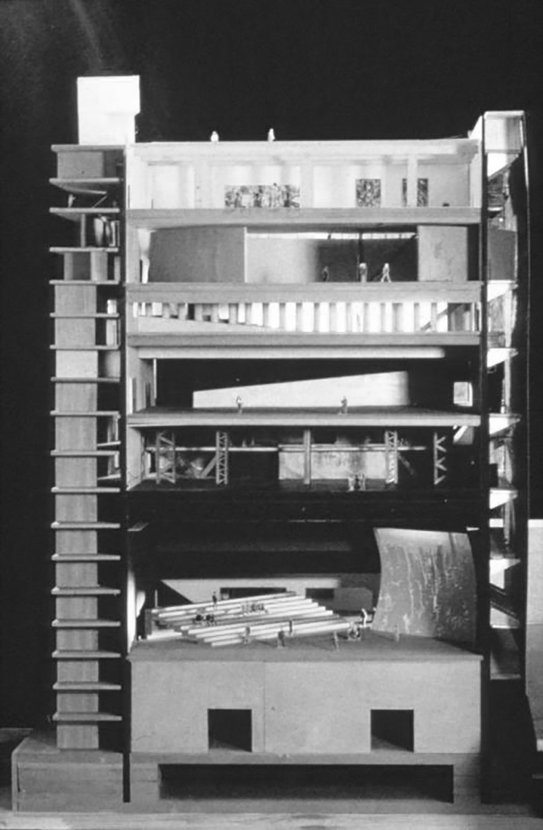 В патенте «Loop-trick» Колхас предлагает «систему пересекающихся рамп, которые уничтожают статус отдельного этажа…, устраняя понятия выше и ниже» [8]. Этот патент был реализован в проекте Кунстхала в Роттердаме (1987 г.) (рис. 6). Здание было задумано как перекресток/площадь между северо-южным и восточно-западными путями. К ним добавляется северо-восточное направление, усиливающее пространственную сложность. С одной стороны, здание выходит на шоссе, с другой – в музейный парк. Разные отметки высот на участке позволили создать пространственный узел, в котором все четыре части объекта были объединены непрерывным путем, проходящим через множественные коллизии подъема и спуска. Посетитель может пройти все программные части здания – выставочное пространство, зрительный зал и далее на крышу здания. Абстрагируясь от функций внутри объекта, можно представить, что перед нами аналог транспортной многоуровневой развязки – оммаж Райту.