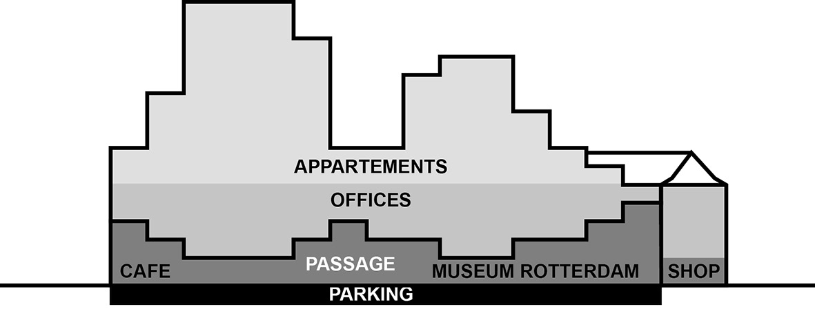 В проекте нового здания мэрии Тиммерхейс в Роттердаме (2015 г.) (рис. 3) концепция социального конденсатора продиктовала многообразие функций. Вместо того чтобы создавать отдельное административное здание, ОМА предлагает структуру, расположенную на участке старой мэрии, которая образует два фасадных фрагмента. Структура состоит из одинаковых модулей, в которой сосуществуют и мэрия, и музей Роттердама, и жилье. Пространственная гибкость, обеспечиваемая конструктивной схемой, позволяет изменять функциональную программу, заменять жилье офисами и наоборот. Нижний уровень полностью открыт для города, позволяя взаимодействие горожан и городской власти. Архитектура объекта стала ответом ОМА на разнородность урбанистической среды Роттердама, где все типы модернизма соседствуют с постмодернистскими и современными объектами. Нейтральность трёхмерной сетки призвана смягчить архитектурные диссонансы окружения, но при этом пространственная сложность позволяет объекту полностью интегрироваться в жизнь города и превратиться в центр притяжения различных потоков: чиновников, посетителей мэрии и музея Резидентов. Тиммерхейс похож на футуристичный остров, живущий своей собственной жизнью, заполняющий все его части, включая крышу, на которой расположены частные сады.