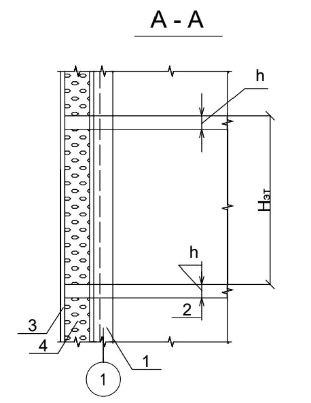 Рис. 2. Разрез А – А по рис. 1 – опирание наружной стены на плиту безбалочного бескапительного перекрытия: 1 – колонна; 2 – плита перекрытия; 3 – наружная грань плиты; 4 – стеновое ограждение; h ‒ толщина монолитной плиты, мм; Нэт – высота этажа здания, мм