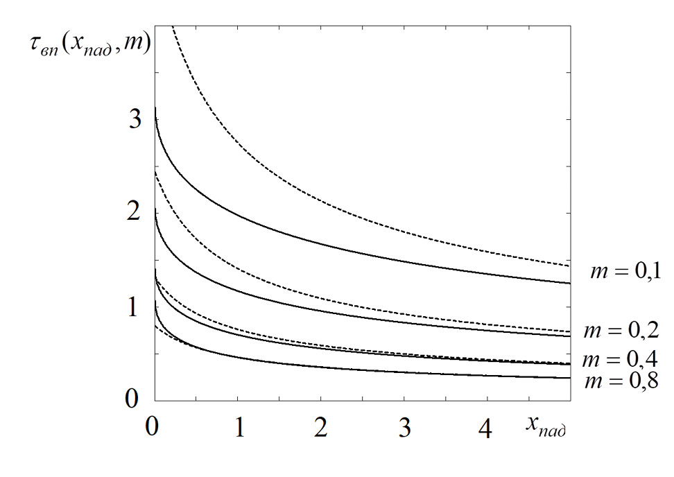 Fig. 2. Dependence of the normalized absorption time τвп(xпад, m) of an inviscid liquid on the normalized drop height of the liquid layer at different porosity values m of the medium. The solid line shows the results of the numerical calculation according to the formula (6), the dashed line shows the results of the approximate analytical formula (7)