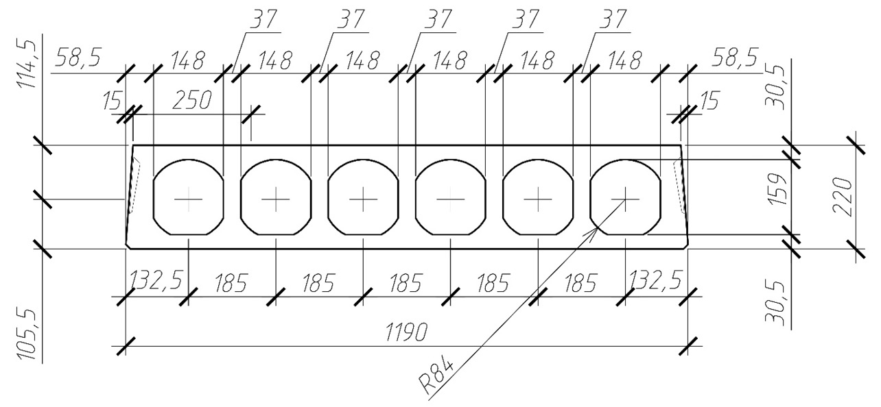 В поперечном сечении плиты имеют шесть продольных пустот сложной формы, разработанных специалистами ПКМ «Татищев» и ВОАО «Опытный завод СМиК». Данная форма пустот позволяет, не уменьшая общую площадь пустот по сравнению с пустотами круглой формы диаметром 159 мм, увеличить толщину поперечных ребер плиты до 37 мм (против 26 мм при круглых пустотах), что увеличивает величину защитного слоя бетона поперечного армирования, обеспечивая тем самым лучшую совместную работу бетона с жесткими вставками каркасов поперечного армирования. Поперечное сечение плиты показано на рис. 2.