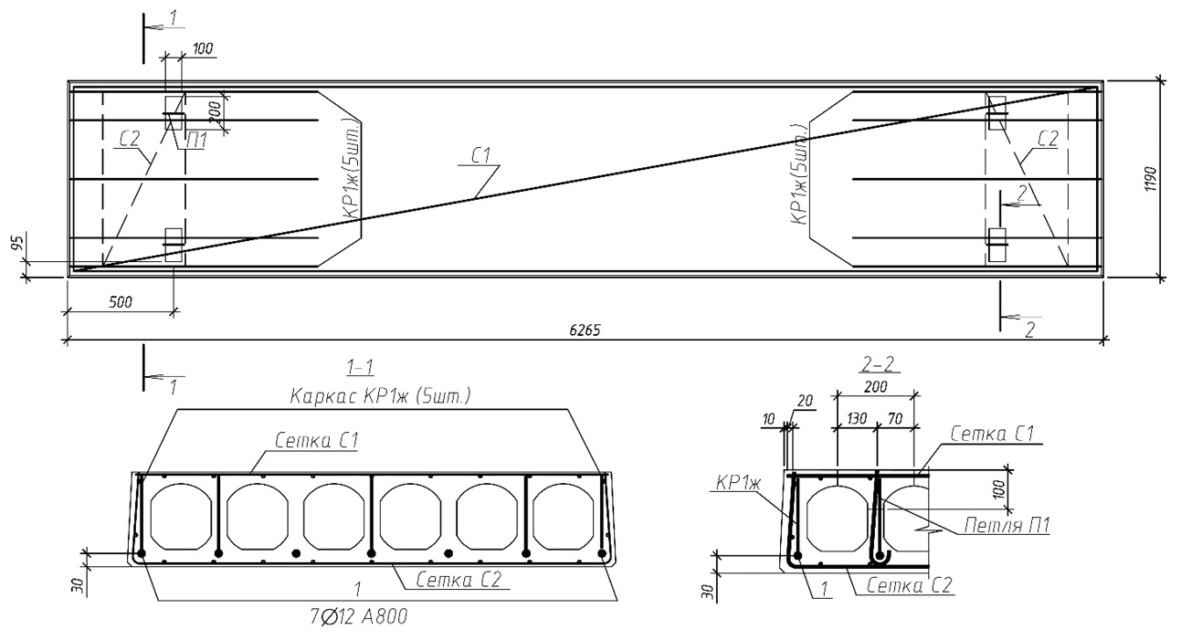 Продольное рабочее армирование в нижней зоне плит представлено семью стержнями диаметром 12 мм класса А800 (установлены в каждом ребре плиты).