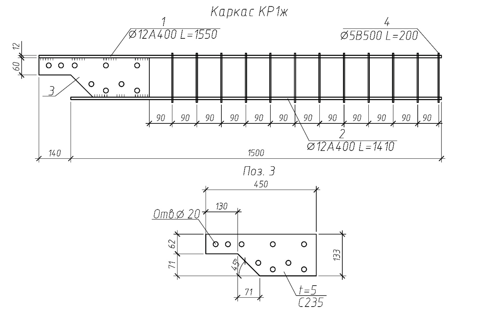 - вариант 1: каркас, сформированный рабочей поперечной арматурой из арматурной проволоки диаметром 5 мм класса В500 (шаг стержней составляет 50 и 90 мм) и одним отгибом, пересекающим подрезку, из арматуры диаметром 10 мм класса А400; продольные монтажные стержни – из арматуры классов А400 и В500;