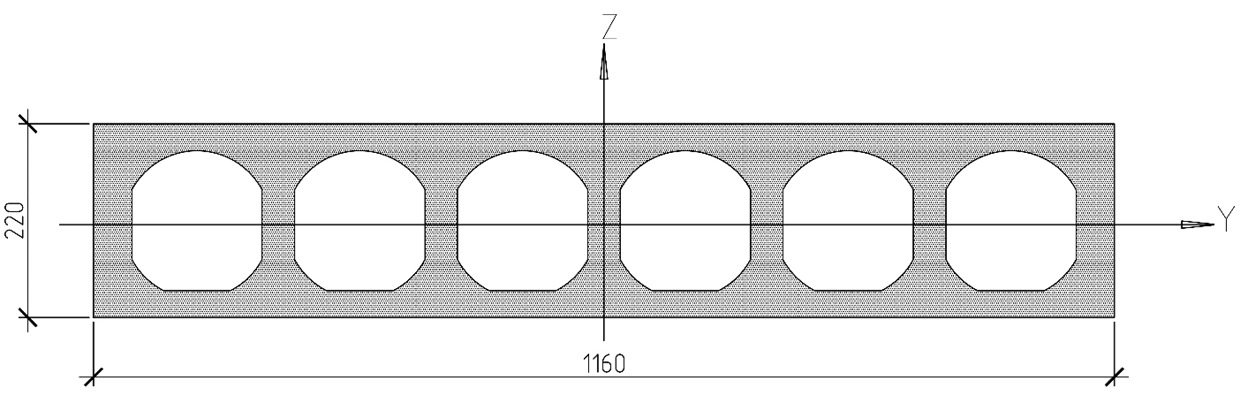 При расчете по образованию и ширине раскрытия трещин, а также по деформациям (вторая группа предельных состояний) геометрические характеристики бетонного сечения плиты и непосредственно пустоты (для определения размеров эквивалентного сечения из условия равенства площади и момента инерции прямоугольника и фактической пустоты) определены посредством «ПК SCAD. Консул». Поперечное сечение плиты и его геометрические характеристики, сформированные «ПК SCAD. Консул», представлены на рис. 6, 7 и в таблице.