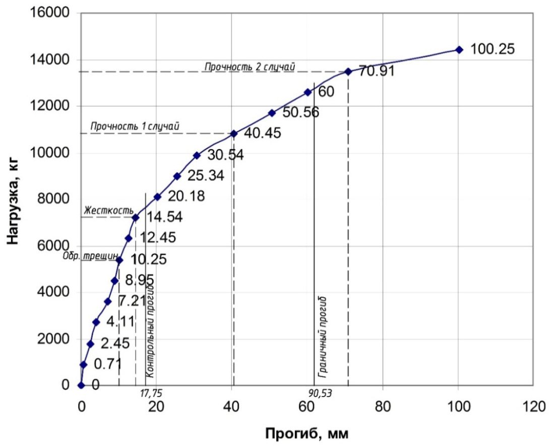 После каждого этапа нагружения конструкция плиты выдерживалась не менее 10 мин, при контрольных нагрузках ‒ не менее 30 мин. При этом велся осмотр образца, фиксировались показания приборов. На всех этапах испытания велась фотофиксация.