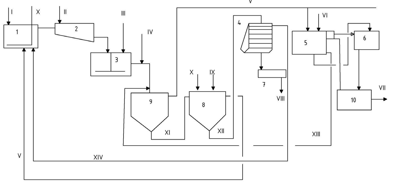 Technological scheme for purification and reuse of acidic iron-containing wash water from pickling departments:1 – equalization tank; 2 – mixer; 3 – flocculation chamber; 4 – filter press; 5 – filter; 6 – pumping station; 7 – dryer; 8 – magnetite production chamber; 9 – settling tank; 10 – cleaning water tank; I – washing waters; II – alkali; III – seed; IV – flocculant; V – clarified water; VI – water for the make-up system; VI I – purified water for the demineralization plant and in production; VIII – dry sludge for disposal or disposal; IX – steam; X – air; XI – sediment; XII – magnetite sludge; XIII – water from filter washing; XIV – filter