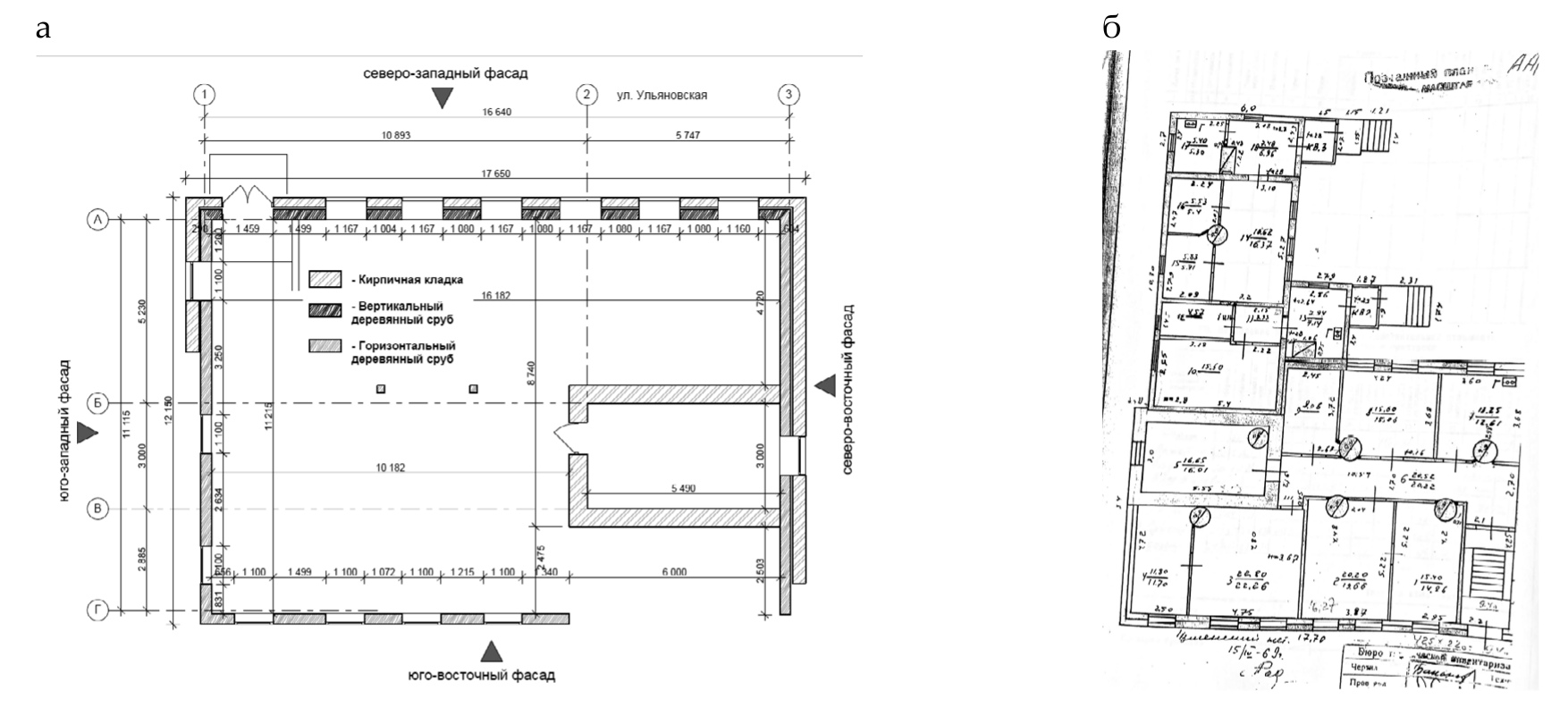 Рис. 2. Обмерочный чертеж первого этажа здания с обозначением ориентации фасадов и материала исполнения несущих конструкций (а); план первого этажа на 1969 г. (б)
