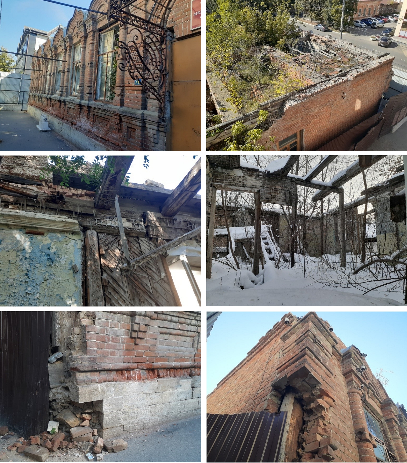 Деревянные элементы внутреннего несущего слоя всех фасадов увлажнены, повсеместно видны следы биологической деструкции. В кирпичной кладке зафиксированы многочисленные трещины шириной раскрытия от 5 до 40 мм. На кладке наблюдаются локальные участки выветривания кирпича и раствора из швов кладки, биопражения в виде плесени, следы интенсивного замачивания кладки: потеки, высолы ввиду отсутствия кровли и, частично, отливов на выступающих декоративных элементах фасадов (см. рис. 4).