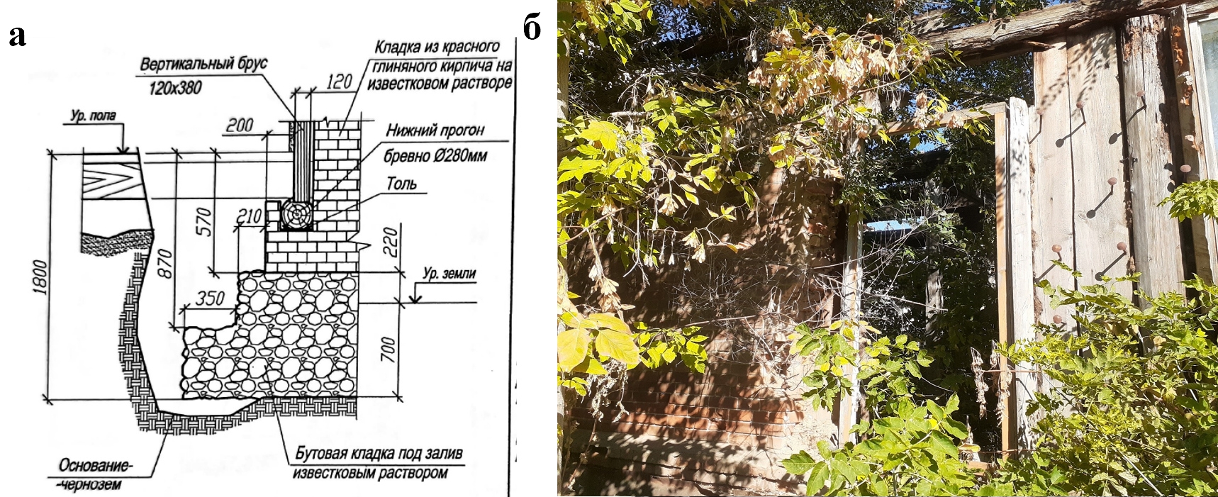 Рис. 5. Шурф существующего фундамента (а); кованые анкера, соединяющие кирпичную кладку и деревянную часть конструкции стены (б)