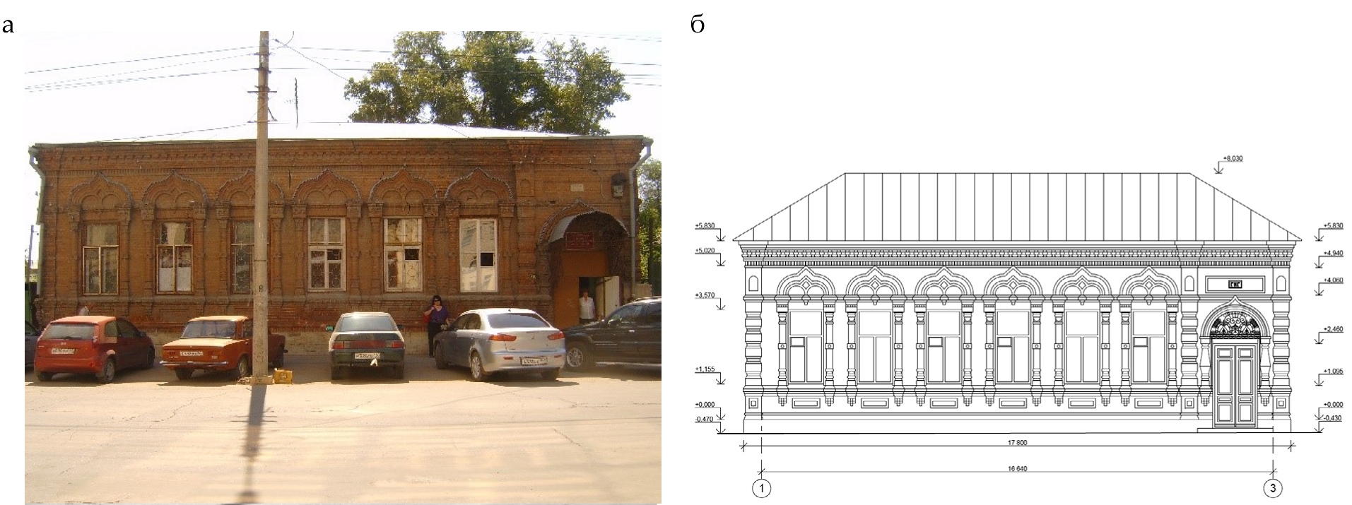 Рис. 6. Фотофиксация главного фасада здания, 2010 г. (а); чертеж главного фасада, отражающий его состояние после проведения работ по реставрации (б)
