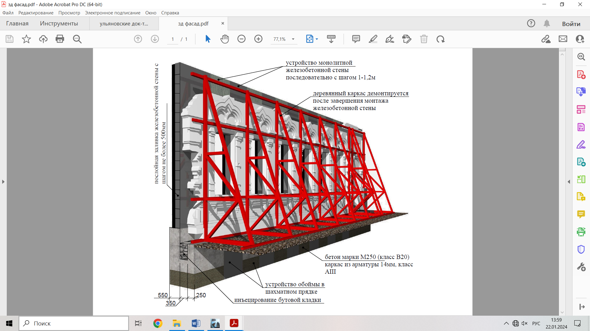 Fig. 7. Diagram of the device: retaining wooden structure on the street side; reinforced concrete reinforcement cage of the foundation and monolithic wall of the main facade