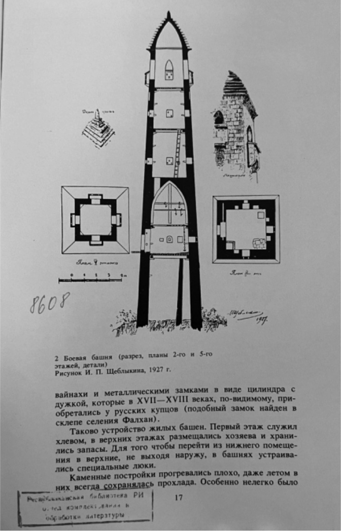 Традиционная чеченская архитектура была по большей части прагматичной и скромной, отвечавшей насущным потребностям сельского населения. Тейпы или традиционные расширенные семейные племенные структуры Чечни, предпочитали прочное каменное строительство, и их наиболее примечательным архитектурным типом были вайнахские башни ‒ каменные сторожевые башни, которые часто служили укрытием для животных или пастухов, а также в оборонительных целях [15] (рис. 2).