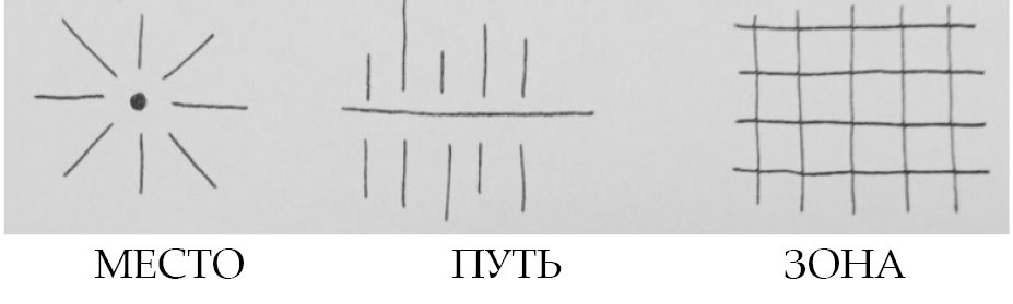Чрезвычайно важным является работа архитектора К. Норберг-Шульца «Existence, Space & Architecture» [12] («Бытие, пространство, архитектура»), в которой он исследует экзистенциальное, т. е. жизненное пространство человека и архитектурное пространство, которое его выражает. В частности, К. Норберг-Шульц утверждает, что архитектурное пространство конкретизирует общественное жизненное пространство, которое включает в себя множество индивидуальных жизненных пространств. Архитектор в своей концепции подробно разбирает элементы архитектурного пространства, такие как место, в котором сосредоточена некоторая масса-центр или цель, точка отсчета, как путь к центру или от него, как зона или район, который содержит места и пути, их объединяющие. Такую структуру Норберг-Шульц характеризует как поле. В понимании Норберг-Шульца в архитектурном пространстве как пространстве экзистенциальном пути и зоны объединяются в одно целое. Вместе они составляют то, что может быть названо «полем» (рис. 2).
