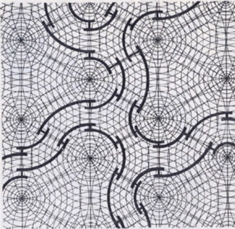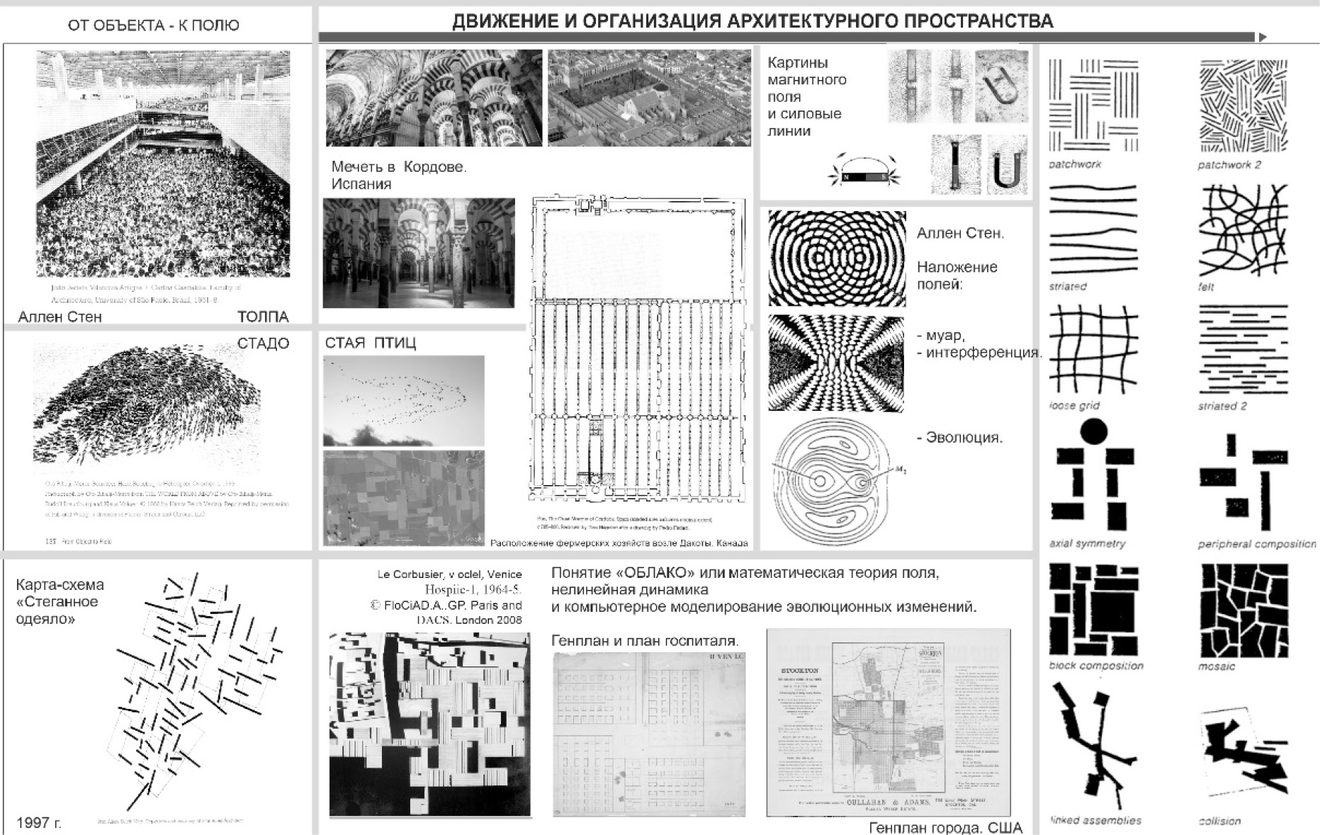 Рассмотрим исследования американского архитектора Стэна Аллена [8, 9]. В его работе «От объекта к полю» происходит смещение акцентов на «полевые условия» или полевую составляющую (рис.10). Аллен вводит понятие сложной геометрии движущихся масс, связанное с изучением динамики, поведения толпы, аналогичной правилам поведения стаи. Он рассматривает состояние поля как движущую силу архитектурной практики. При этом наложение двух регулярных полей приводит в его интерпретации к появлению «муара». Он отмечает, что эффекты муара часто используются для измерения скрытых напряжений в непрерывных полях, для отображения сложных фигурных форм. Это характеризуется как расширенное поле [8].