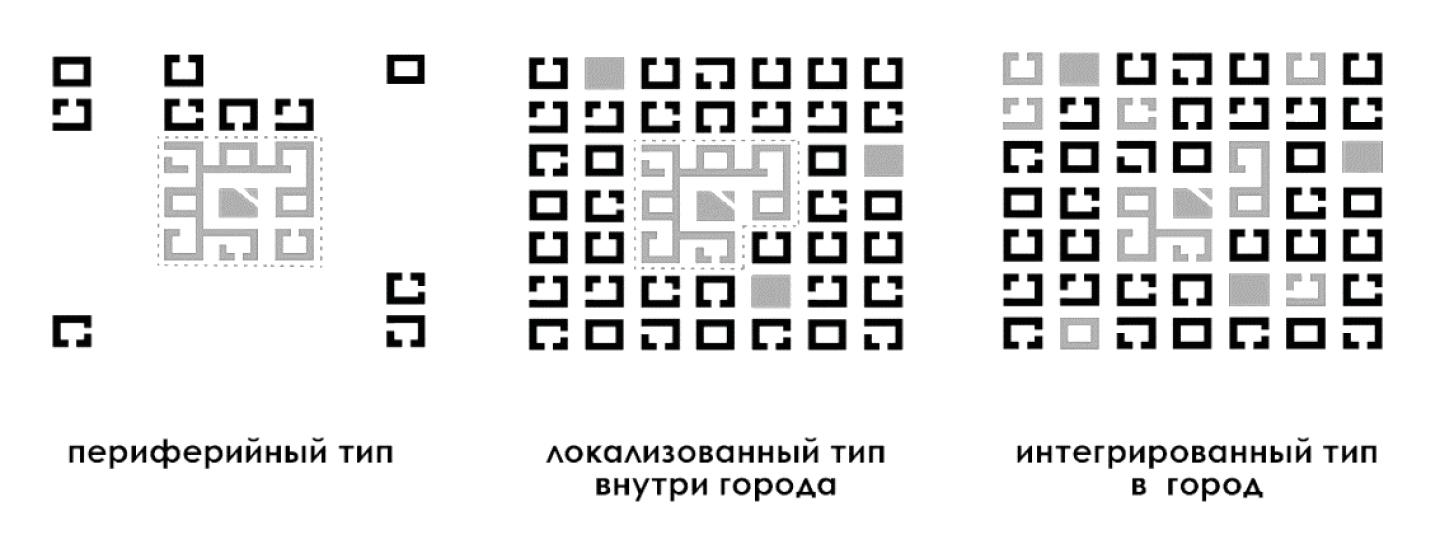 В настоящее время в контексте изучения современных мегаполисов выделяют несколько подходов к размещению кампусов: периферийный, локализованный и интегрированный (рис. 1) [9].