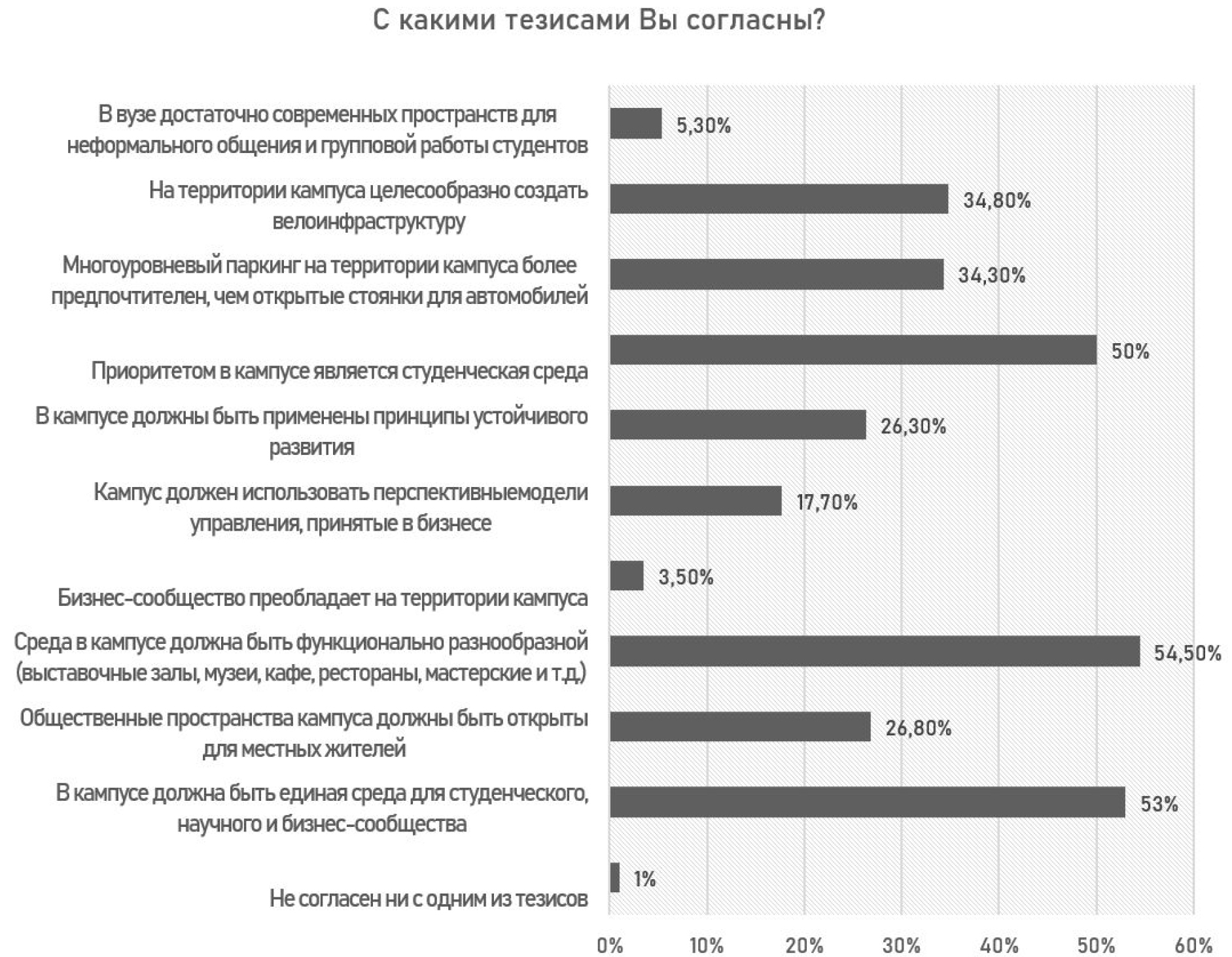Результаты опроса показали, насколько важно внедрение кампуса в городскую среду: 143 (72,2 %) респондента ответили, что кампус должен располагаться в городской среде, 22 (11,1 %) – располагаться на периферии, 7 (3,5 %) – располагаться за городом, 26 (13,2 %) – затрудняются с ответом.