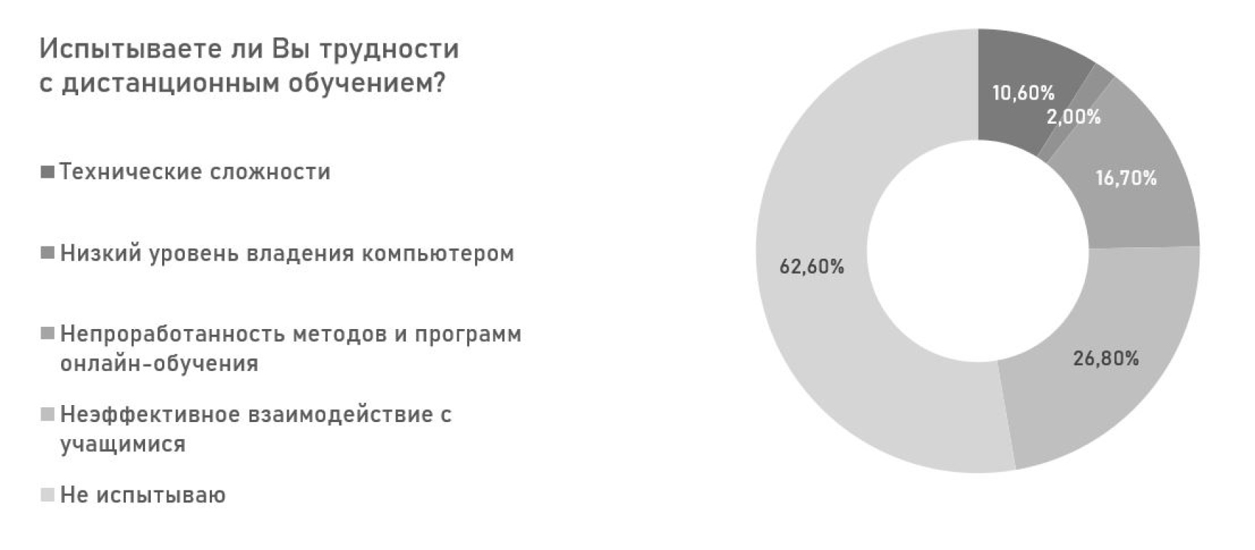 Отмечено, что недостаточен набор базовых узконаправленных функций для студентов и преподавателей: наличие культурно-досуговой, туристической и рекреационной инфраструктуры даст больше возможностей для разнообразного отдыха. Преподаватели подчеркивают, что на территории университетов мало пространств для неформального общения и самостоятельной групповой работы студентов. Также респонденты отметили, что территорию кампуса необходимо обеспечить многоуровневым паркингом, вместо открытых стоянок автомобилей, и велоинфраструктурой (рис. 5). 62,6 % респондентов не испытывают трудности с дистанционным обучением, указывая на то, что система дистанционного обучения в целом работает эффективно и доступна для большинства пользователей (рис. 6).