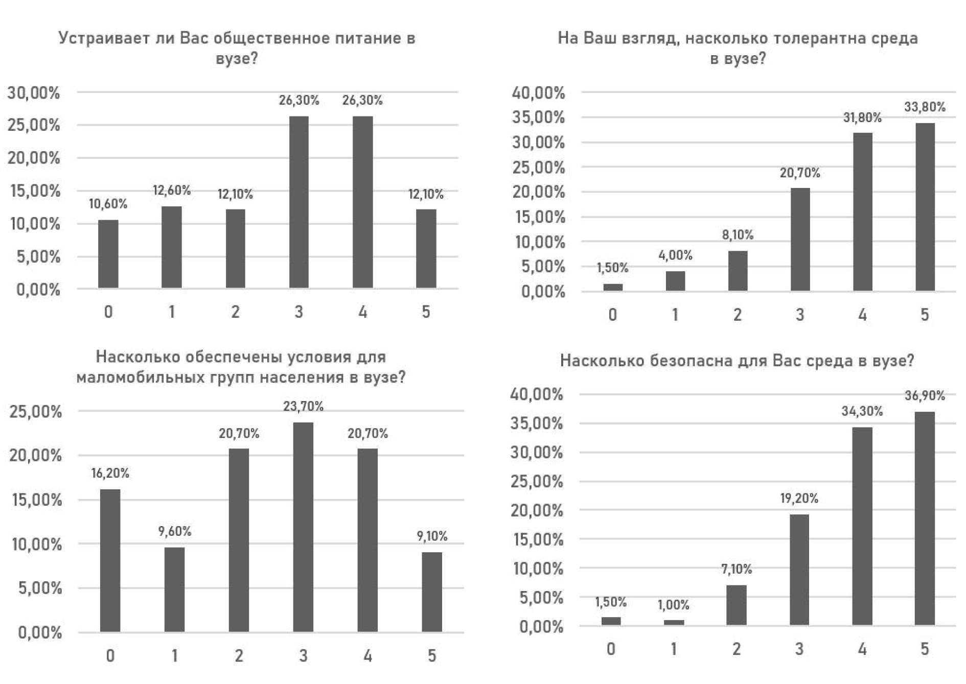 Рис. 7. Диаграммы ответов об общественном питании и безопасности на территории вуза по шкале от 0 до 5 (где 0 – не устраивает, а 5 – полностью устраивает)