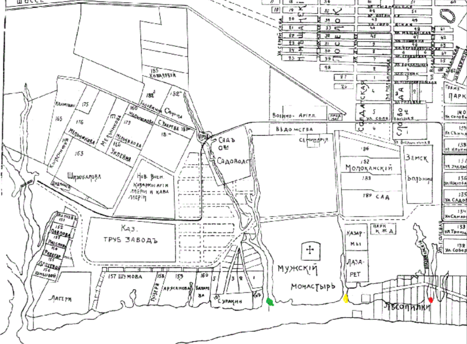 Fig. 5. Plan of ravines in the area of Chelyuskintsev‒Osipenko‒Polevaya streets, Samara, 1913: red arrow ‒ Field descent; yellow ‒ st. Osipenko, green ‒ st. Chelyuskintsev
