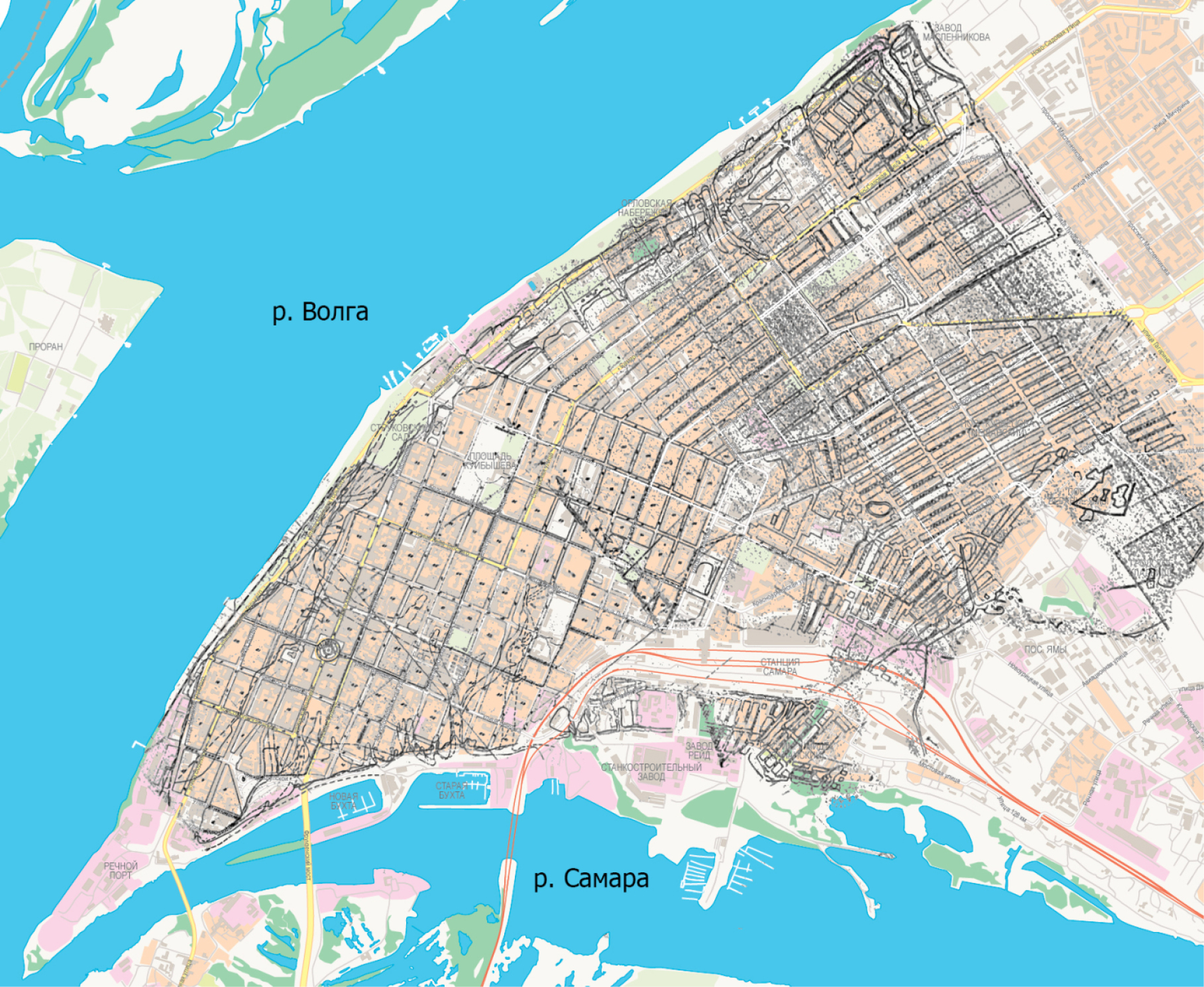 Fig. 10. Map of buried ravines on the territory of Samara (made by the authors on the basis of the “Plan of Kuibyshev with an indication of the location of covered ravines on the territory of the city (based on the plans of old surveys)”