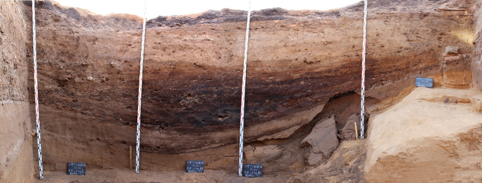 Fig. 11. A buried ravine (hollow) in an archaeological excavation site on the territory of Khlebnaya Square, filled with organogenic deposits (photo by D.V. Kormilitsyn)