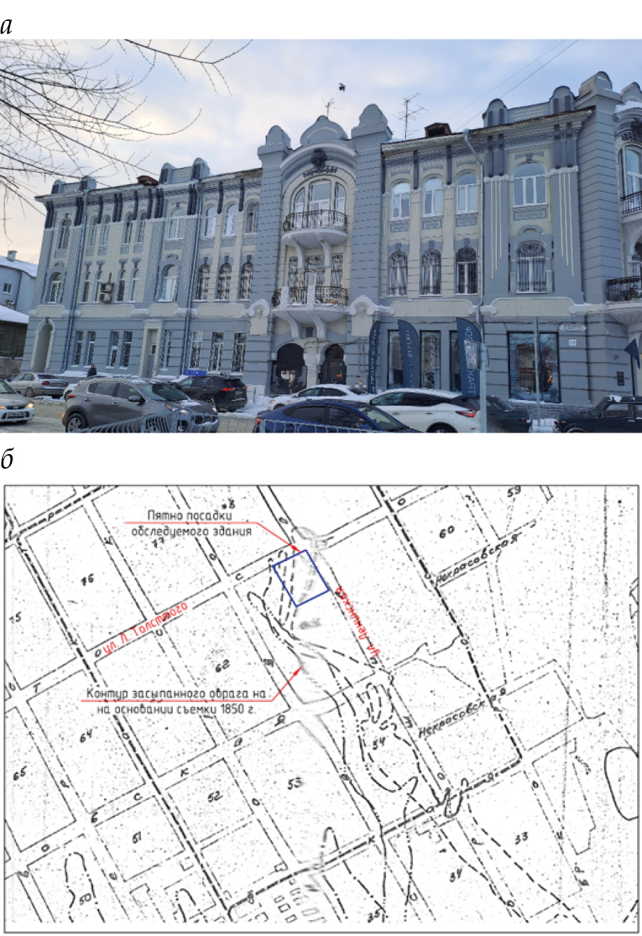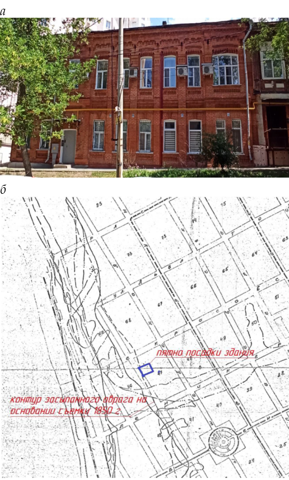 Рис. 15. Общий вид (а) и местоположение на схеме засыпанных оврагов (б) объекта 2 ‒ здание «Дом Филимонова»