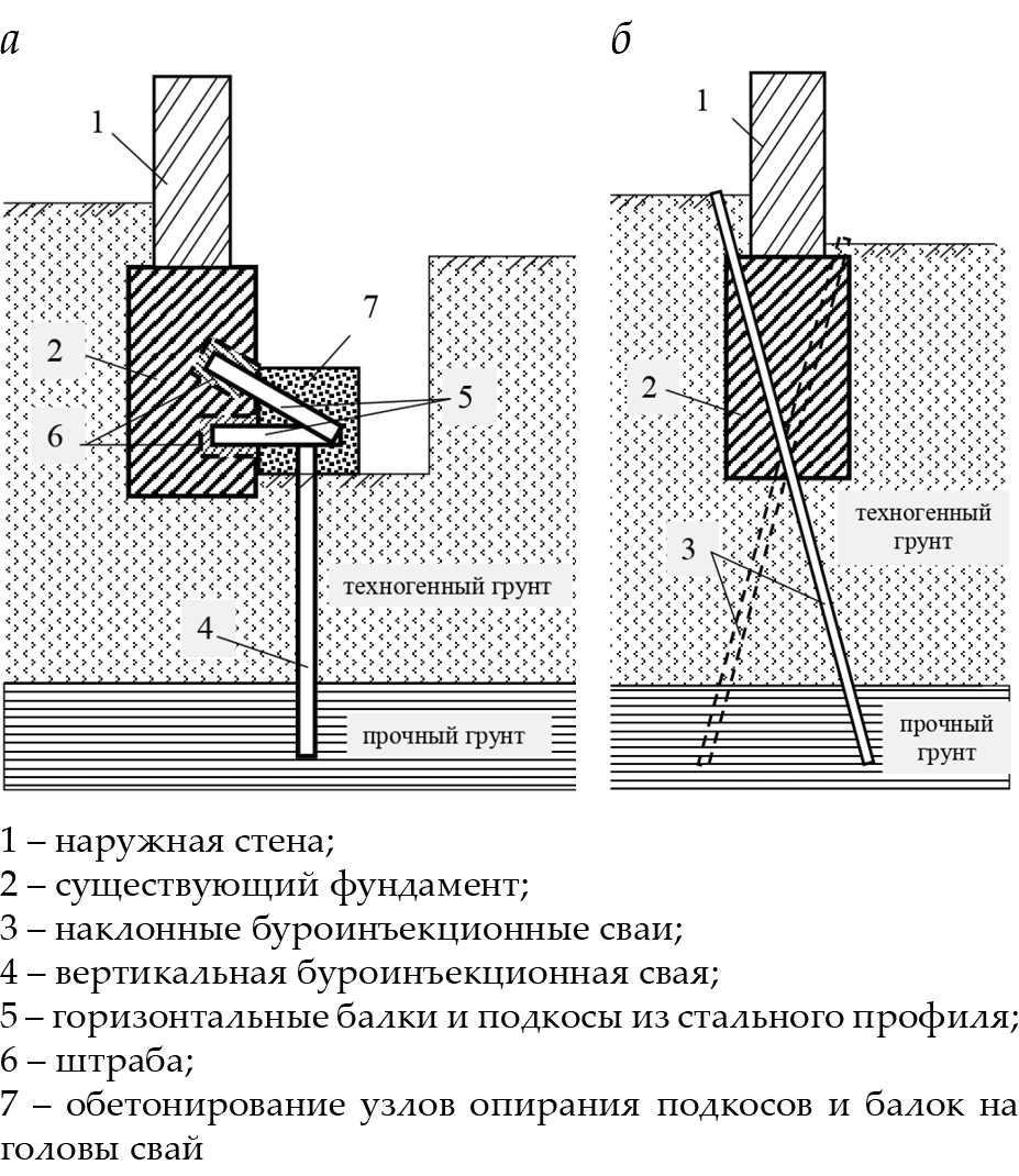 Fig. 14. Schemes for strengthening the foundations of existing buildings with bored piles: a – vertical; b – inclined