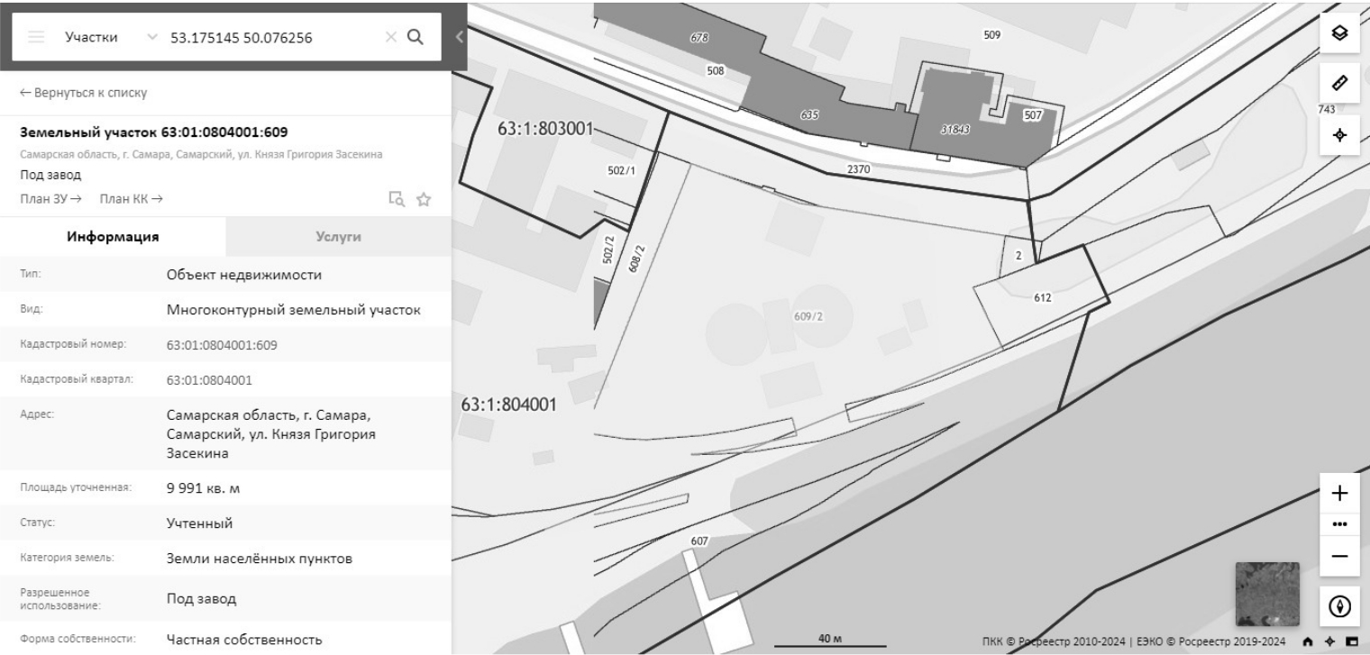Земельный участок бывшего зернохранилища представляет собой территорию площадью 9 991 м2. На рис. 3 видно несколько построек, одним из которых является здание элеватора. Большая территория пустует, что дает возможность дальнейшего ее использования под благоустройство зеленой территории, площади для проведения различных мероприятий и т. д.