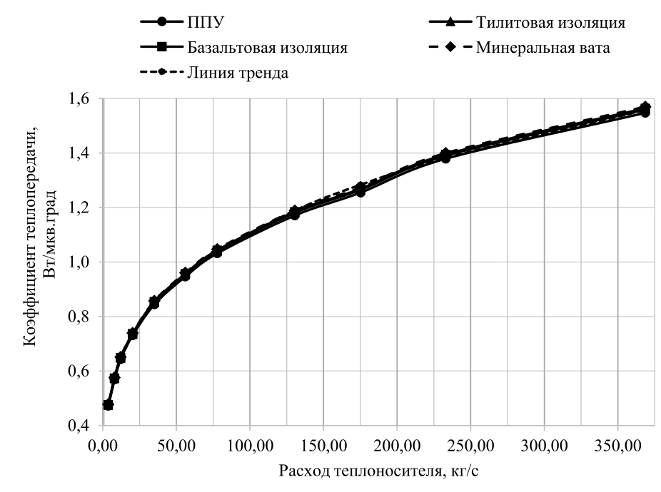 Результаты расчета показали, что для любых способов прокладки термическая проводимость конструкций трубопроводов с различными теплоизоляционными материалами имеют близкие по значению зависимости (рис. 1). Наибольшее отклонение между коэффициентами теплопередачи составило 1,9 %, т. е. вид тепловой изоляции глобально не влияет на коэффициент теплопередачи. Поэтому можно вести обобщенный расчет потерь тепловой энергии через ограждающие конструкции трубопроводов без учета типа тепловой изоляции.