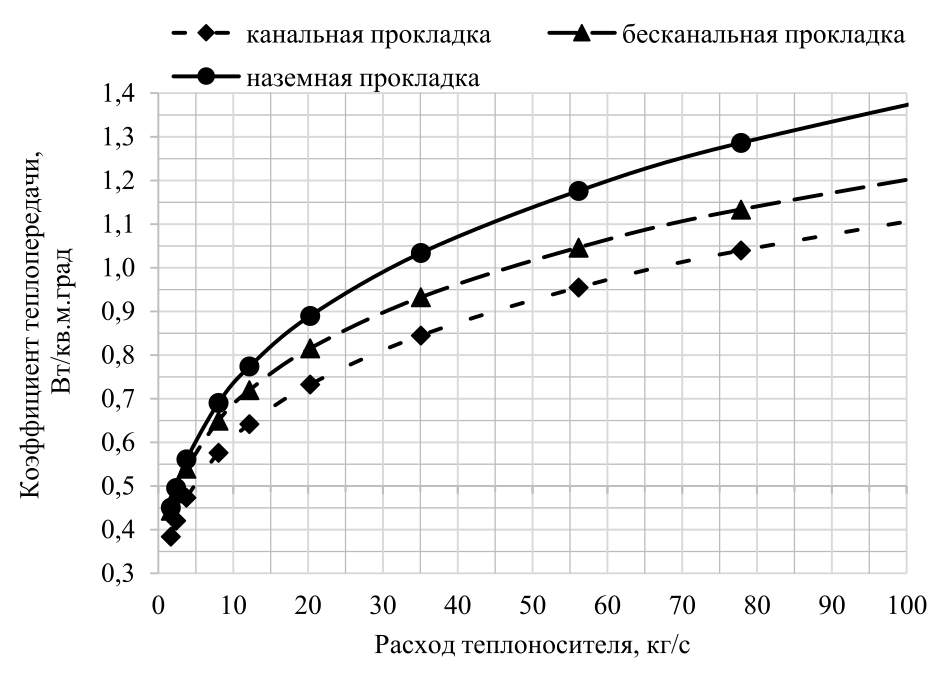 Рис. 3. Коэффициент теплопередачи конструкций трубопроводов для различных условий прокладки в условиях Волгоградской области в зависимости от расхода теплоносителя