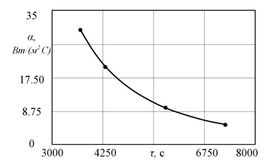 Рис. 5. Зависимость времени выхода на стационарное значение от коэффициента теплоотдачи окружающей среды