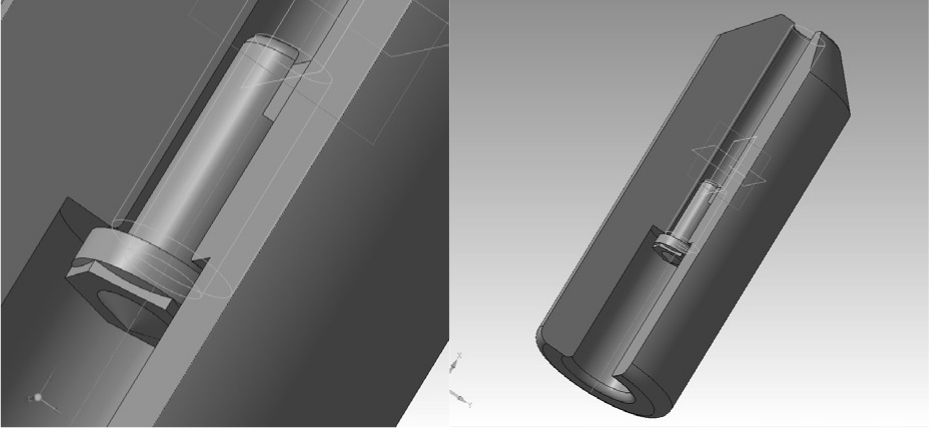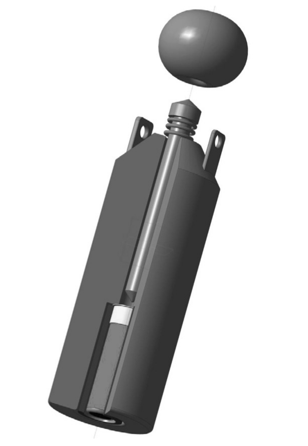 На рис. 1 показано устройство, в котором капсюль накалывает ударник. При ударе о дно торцом изделия и его резком останове подпружиненный кинетический ударник по инерции продолжит движение в сторону капсюля, пока не наколет его. Недостаток конструкции – критичность связи соотношений между собой жёсткости пружины, веса ударника и высоты сброса. Необходимо точнее сбалансировать величину кинетического удара: жёсткость пружины сжатия с весом ударника-накольника и скоростью удара изделия (высотой падения). Следует проверить касание ударника при холостом ударе без боевого патрона. Пружина может быть самостоятельного изготовления навивкой из подходящей проволоки. Нельзя допускать, чтобы в горизонтальном положении изделие было безопасное, а при ориентации вертикально в скважину оно могло бы сработать в руках из-за слабой пружины или большого веса ударника. Преимущество устройства заключается в том, что патрон скрыт внутри изделия, что обеспечивает безотказную работу, хорошую ремонтопригодность. Кончик ударника или весь ударник должен быть закалённым.
