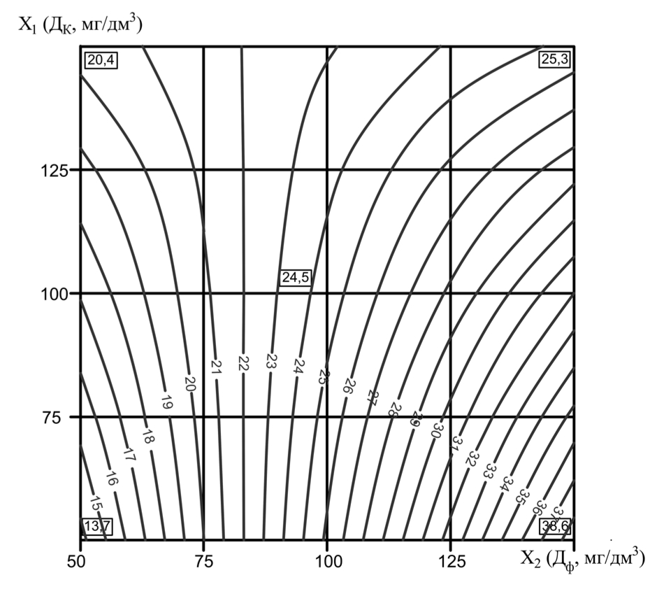 2 | 2 | r=24,5-1,65∙X1+7,48∙X2-5,0∙X1∙X2 | r=-7,16+0,167∙Дк+0,3496∙Дф-0,002∙Дк∙ Дф | |