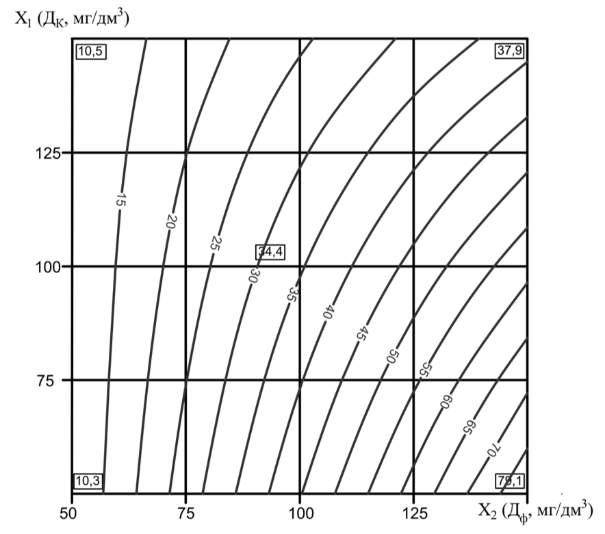 2 | 8 | r=43,1-14,32∙X1+1,82∙X2+16,58∙X1∙X2 | r=134,42-0,9496∙Дк-0,6267∙Дф+0,006632∙Дк∙ Дф | |