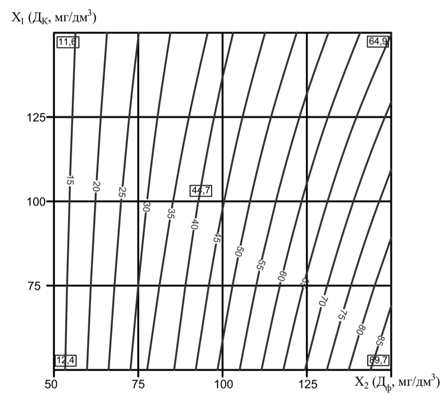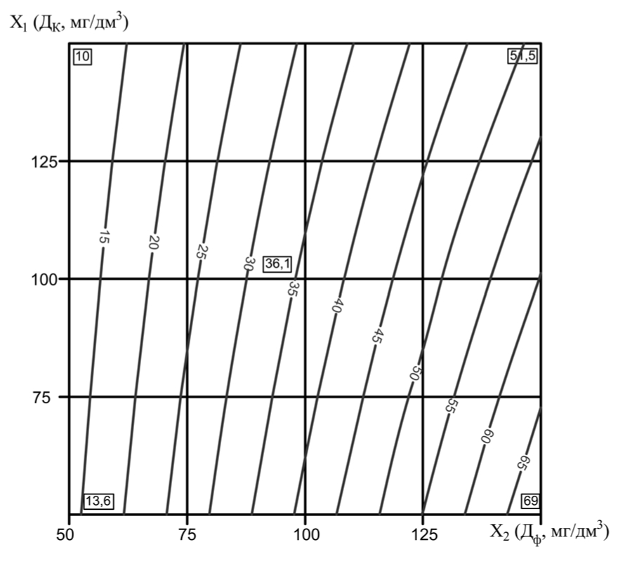 2 | 12 | r=716,02-376,42∙X1+697,58∙X2-371,28∙X1∙X2 | r=-1411,4+7,323∙Дк+28,8∙Дф-0,1485∙Дк∙ Дф |